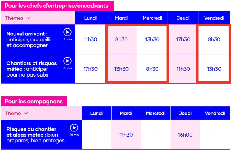 Deux webinaires (sessions encadrés en rouge ci-dessous) seront co-animés par des professionnels de la prévention de BTP santé au travail.